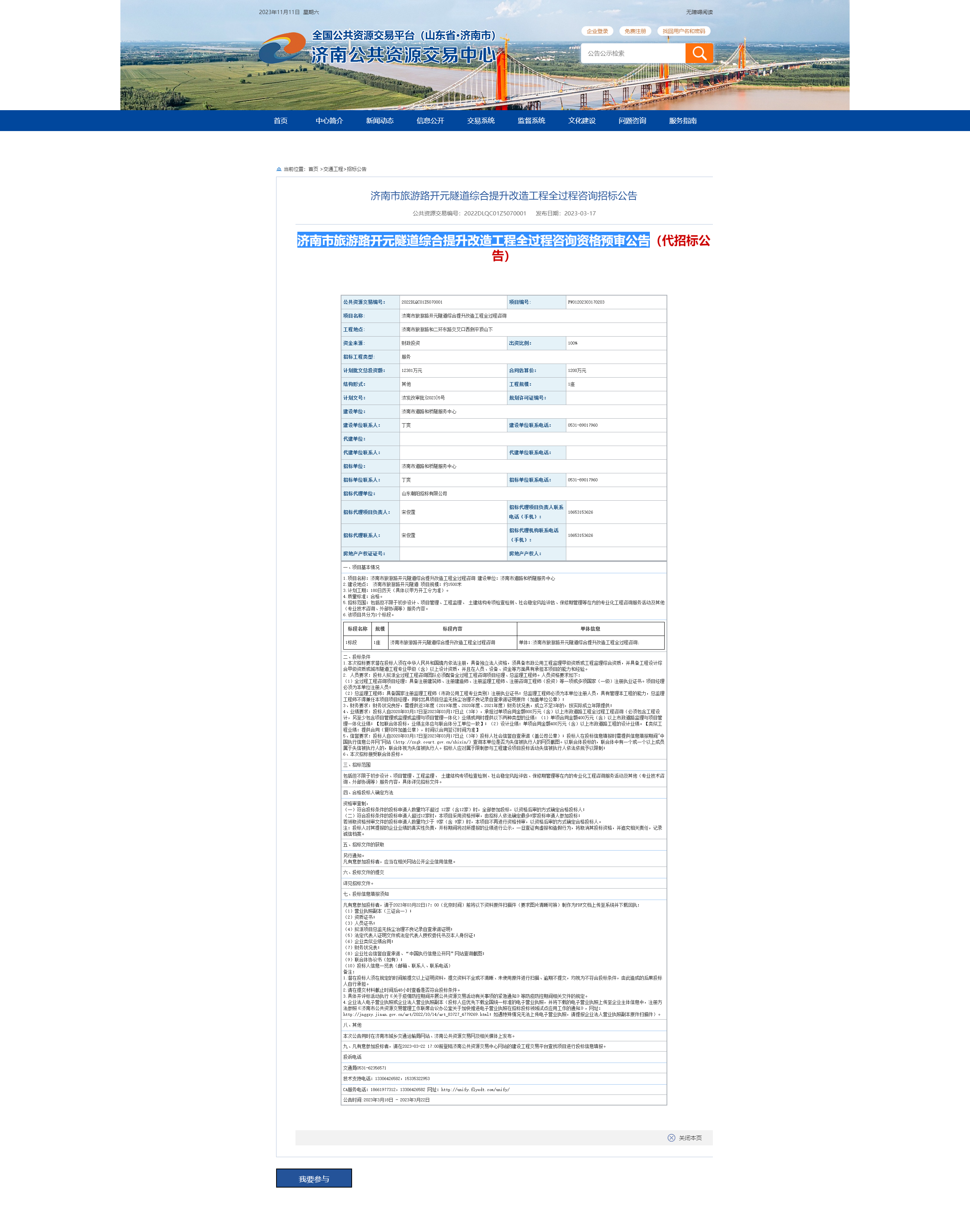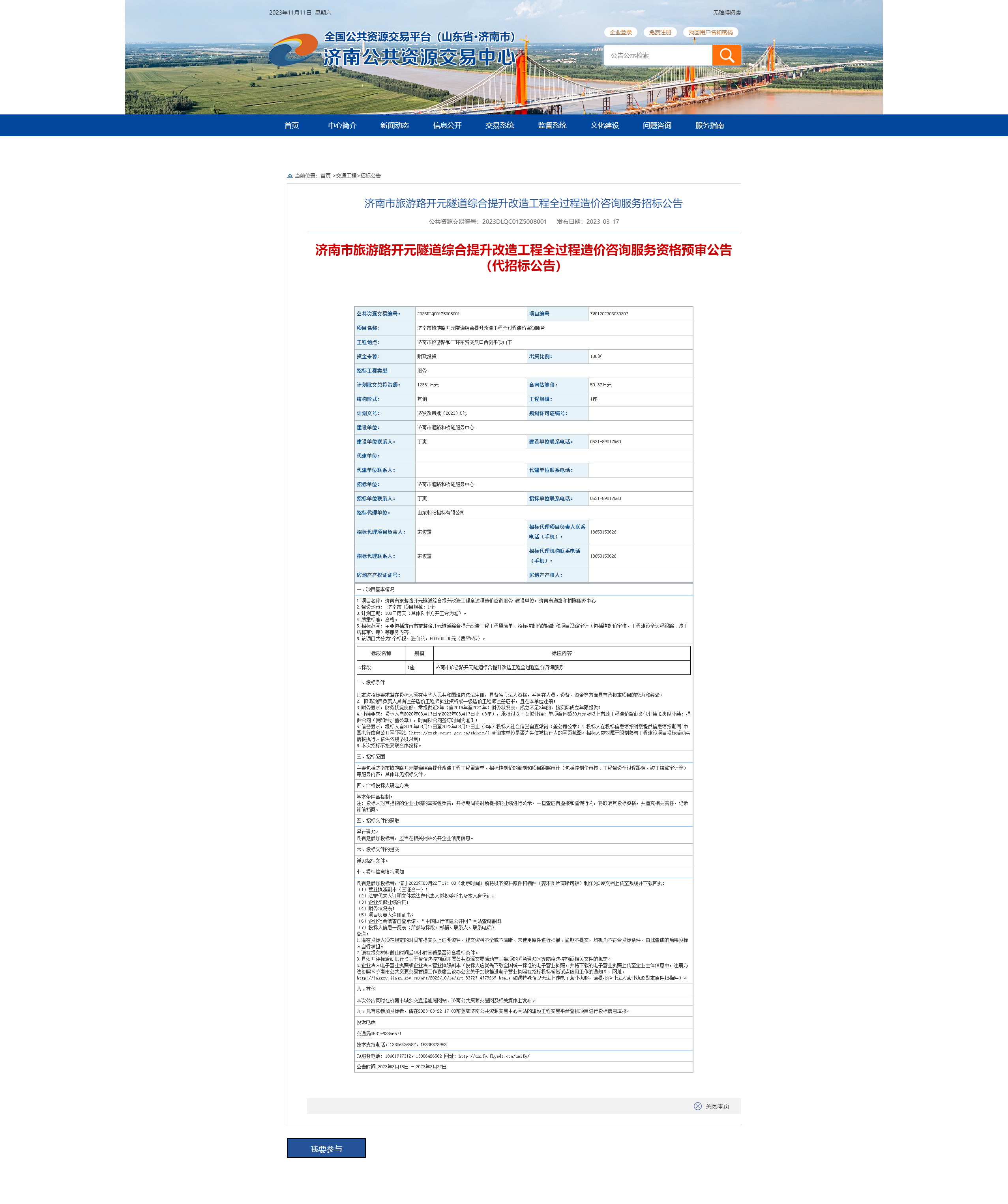 1、濟(jì)南市旅游路開元隧道綜合提升改造工程全過程造價(jià)咨詢服務(wù)招標(biāo)信息