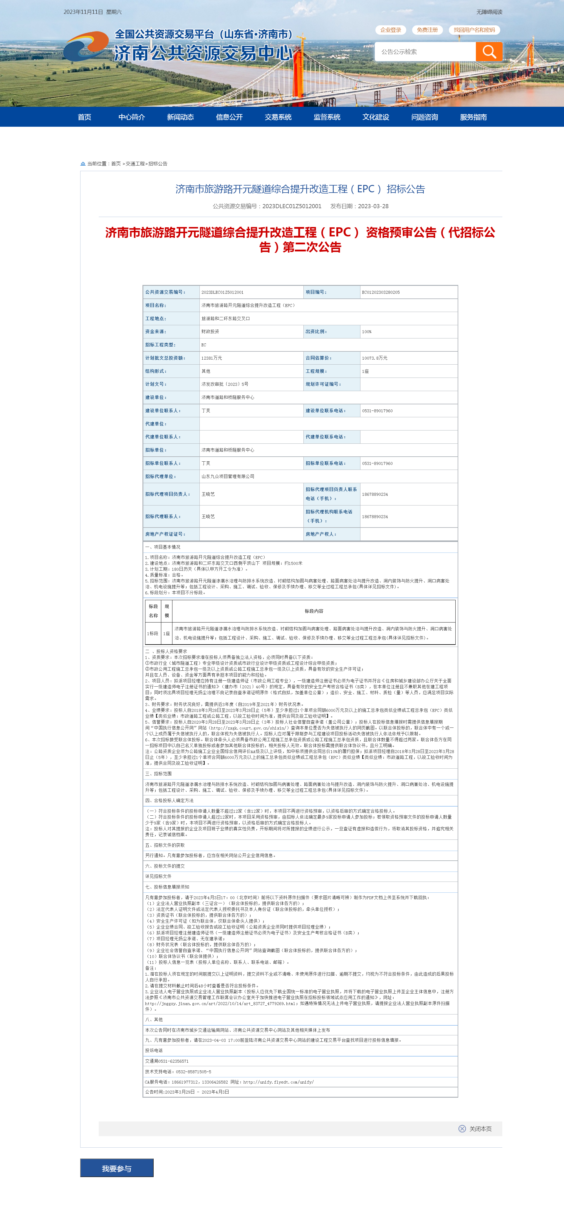 (1)濟(jì)南市旅游路開元隧道綜合提升改造工程(EPC) 資格預(yù)審公告(代招標(biāo)公告)第二次公告