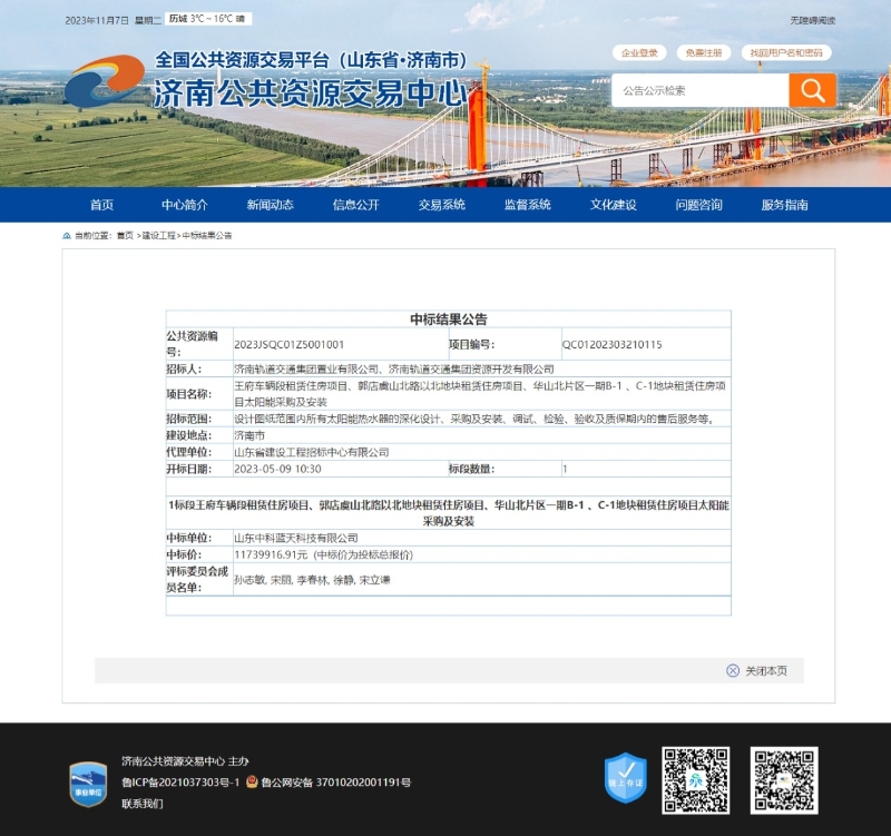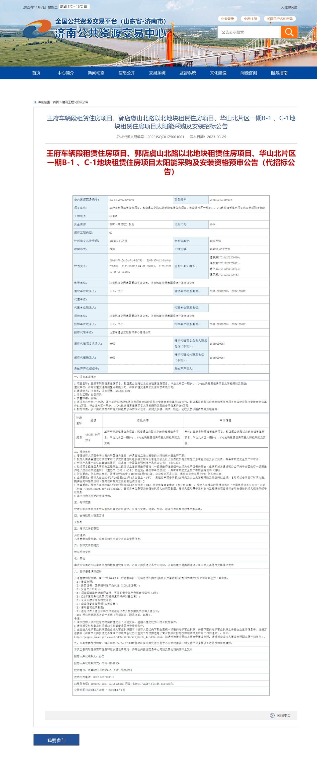 【招標投標信息】王府車輛段租賃住房項目招標投標信息(太陽能) 發布日期:2023-12-01 16:47 信息來源:濟南市人民政府辦公廳 瀏覽次數:次 字體:【 默認 大 超大 】 【打印本頁】 【關閉窗口】
