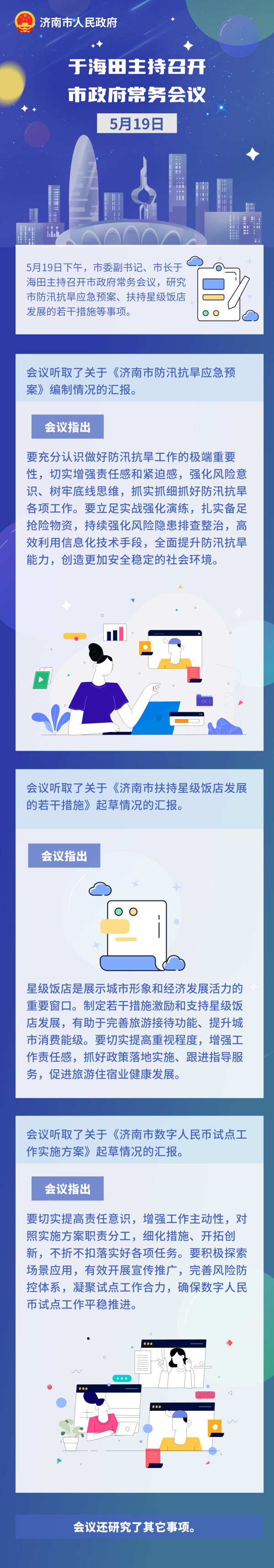 5月19日下午,市委副書記、市長于海田主持召開市政府常務會議,研究市防汛抗旱應急預案、扶持星級飯店發展的若干措施等事項。