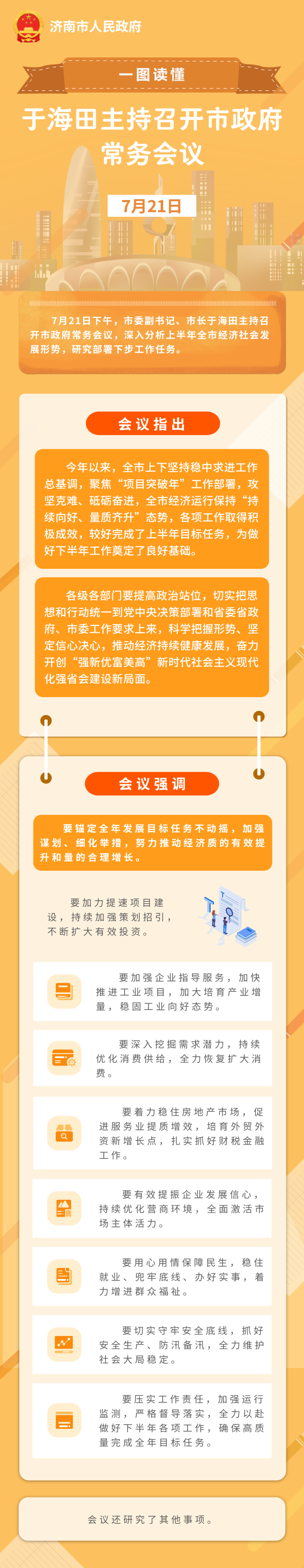 7月21日下午,市委副書記、市長于海田主持召開市政府常務會議,深入分析上半年全市經濟社會發展形勢,研究部署下步工作任務。