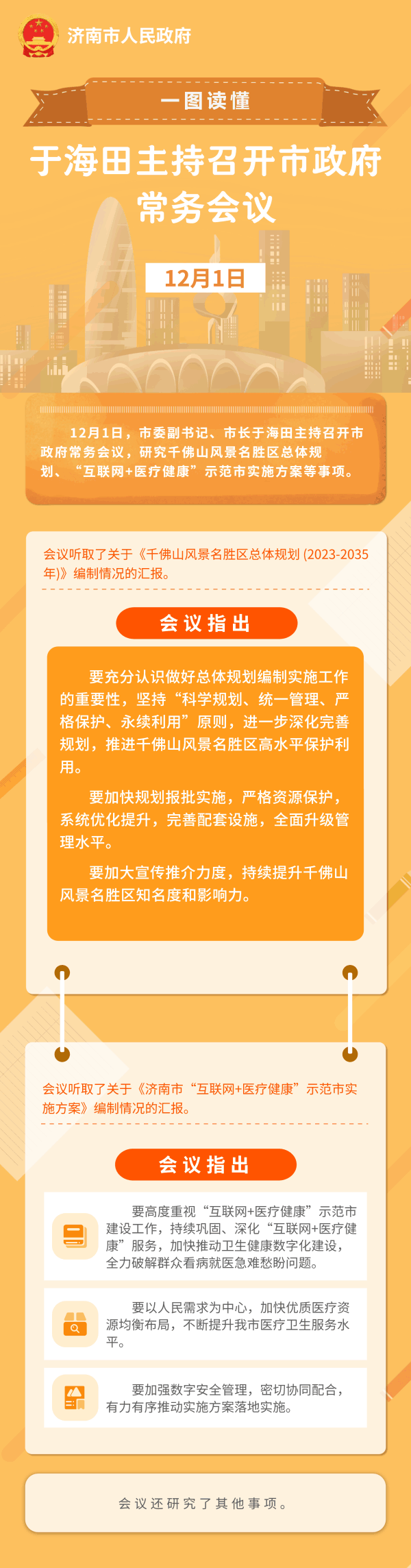 12月1日,市委副書記、市長于海田主持召開市政府常務會議,研究千佛山風景名勝區總體規劃、“互聯網+醫療健康”示范市實施方案等事項。