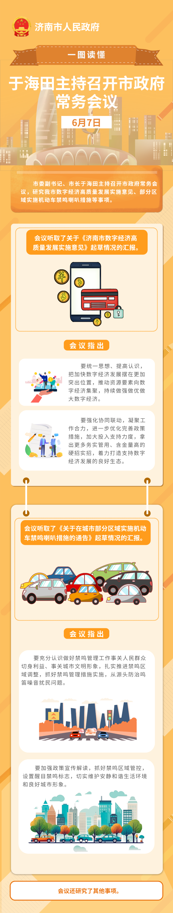 6月7日,市委副書記、市長于海田主持召開市政府常務會議,研究我市數字經濟高質量發展實施意見、部分區域實施機動車禁鳴喇叭措施等事項。
