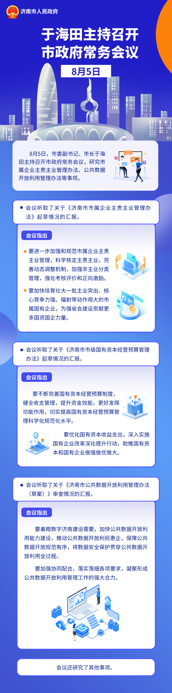 8月5日,市委副書記、市長于海田主持召開市政府常務(wù)會議,研究市屬企業(yè)主責(zé)主業(yè)管理辦法、公共數(shù)據(jù)開放利用管理辦法等事項。