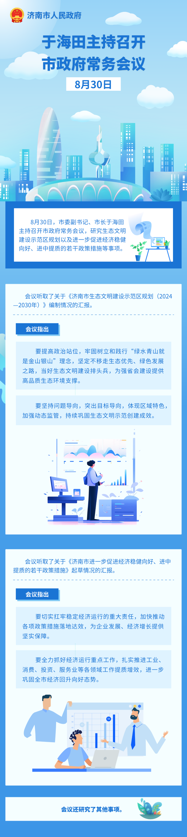 8月30日,市委副書記、市長于海田主持召開市政府常務(wù)會(huì)議,研究生態(tài)文明建設(shè)示范區(qū)規(guī)劃以及進(jìn)一步促進(jìn)經(jīng)濟(jì)穩(wěn)健向好、進(jìn)中提質(zhì)的若干政策措施等事項(xiàng)。