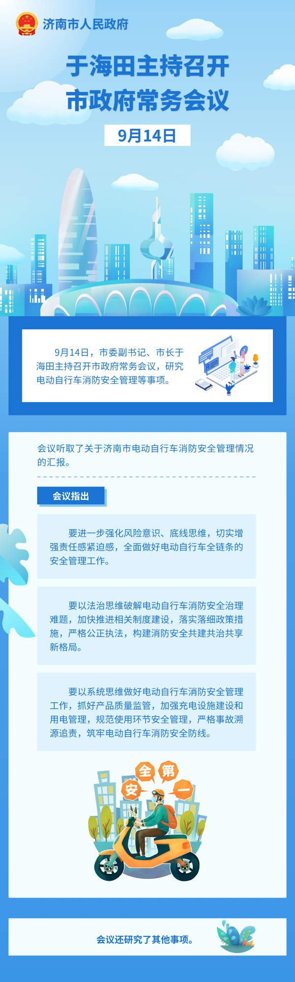 9月14日,市委副書記、市長于海田主持召開市政府常務會議,研究電動自行車消防安全管理等事項。