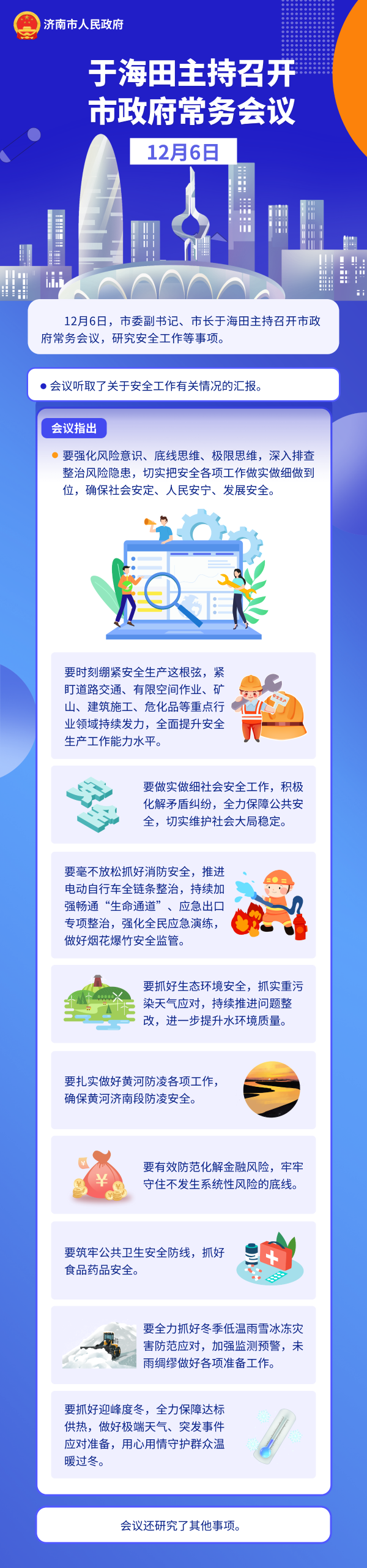會議聽取了關于安全工作有關情況的匯報。會議指出,要強化風險意識、底線思維、極限思維,深入排查整治風險隱患,切實把安全各項工作做實做細做到位,確保社會安定、人民安寧、發展安全。要時刻繃緊安全生產這根弦,緊盯道路交通、有限空間作業、礦山、建筑施工、危化品等重點行業領域持續發力,全面提升安全生產工作能力水平。要做實做細社會安全工作,積極化解矛盾糾紛,全力保障公共安全,切實維護社會大局穩定。要毫不放松抓好消防安全,推進電動自行車全鏈條整治,持續加強暢通“生命通道”、應急出口專項整治,強化全民應急演練,做好煙花爆竹安全監管。要抓好生態環境安全,抓實重污染天氣應對,持續推進問題整改,進一步提升水環境質量。要扎實做好黃河防凌各項工作,確保黃河濟南段防凌安全。要有效防范化解金融風險,牢牢守住不發生系統性風險的底線。要筑牢公共衛生安全防線,抓好食品藥品安全。要全力抓好冬季低溫雨雪冰凍災害防范應對,加強監測預警,未雨綢繆做好各項準備工作。要抓好迎峰度冬,全力保障達標供熱,做好極端天氣、突發事件應對準備,用心用情守護群眾溫暖過冬。