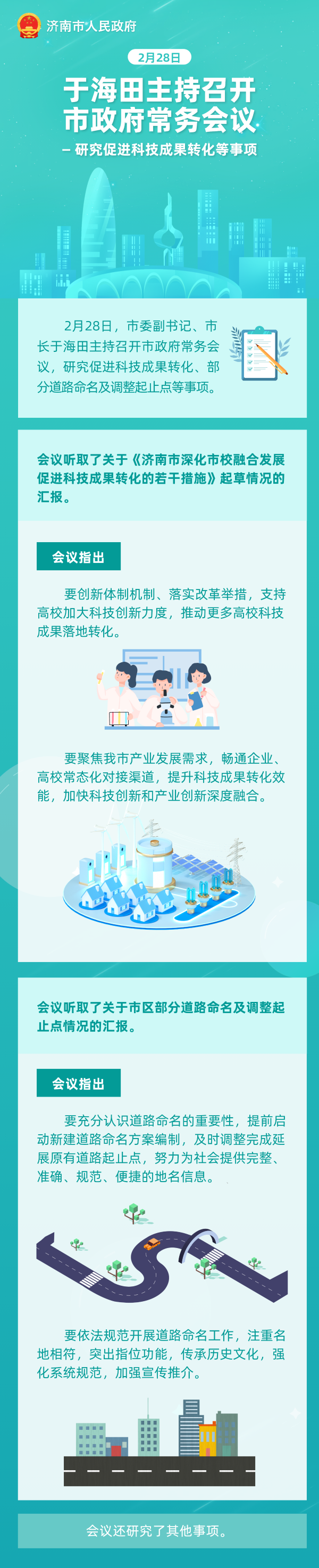 2月28日,市委副書記、市長于海田主持召開市政府常務(wù)會議,研究促進(jìn)科技成果轉(zhuǎn)化、部分道路命名及調(diào)整起止點(diǎn)等事項(xiàng)。