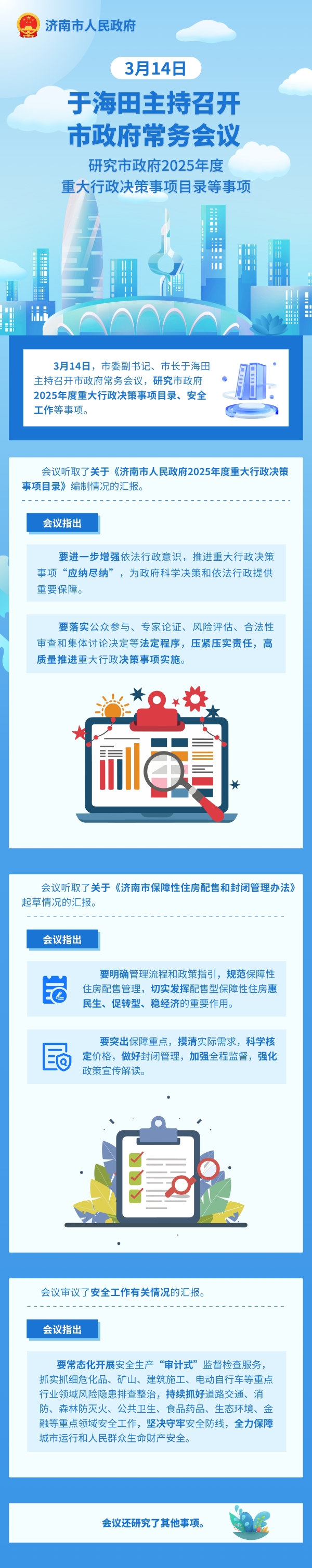 會議聽取了關于《濟南市人民政府2025年度重大行政決策事項目錄》編制情況的匯報。會議指出,要進一步增強依法行政意識,推進重大行政決策事項“應納盡納”,為政府科學決策和依法行政提供重要保障。要落實公眾參與、專家論證、風險評估、合法性審查和集體討論決定等法定程序,壓緊壓實責任,高質量推進重大行政決策事項實施。