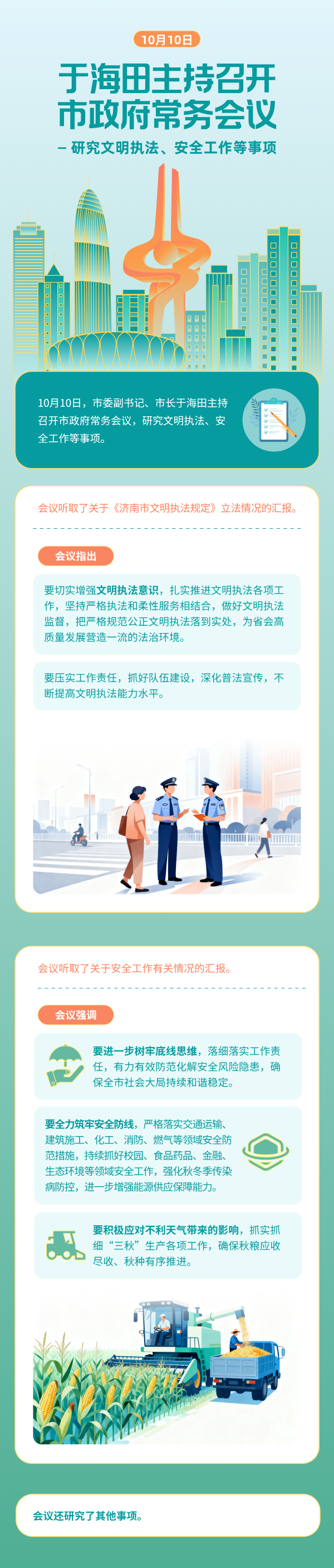 10月10日,市委副書記、市長于海田主持召開市政府常務會議,研究文明執法、安全工作等事項。