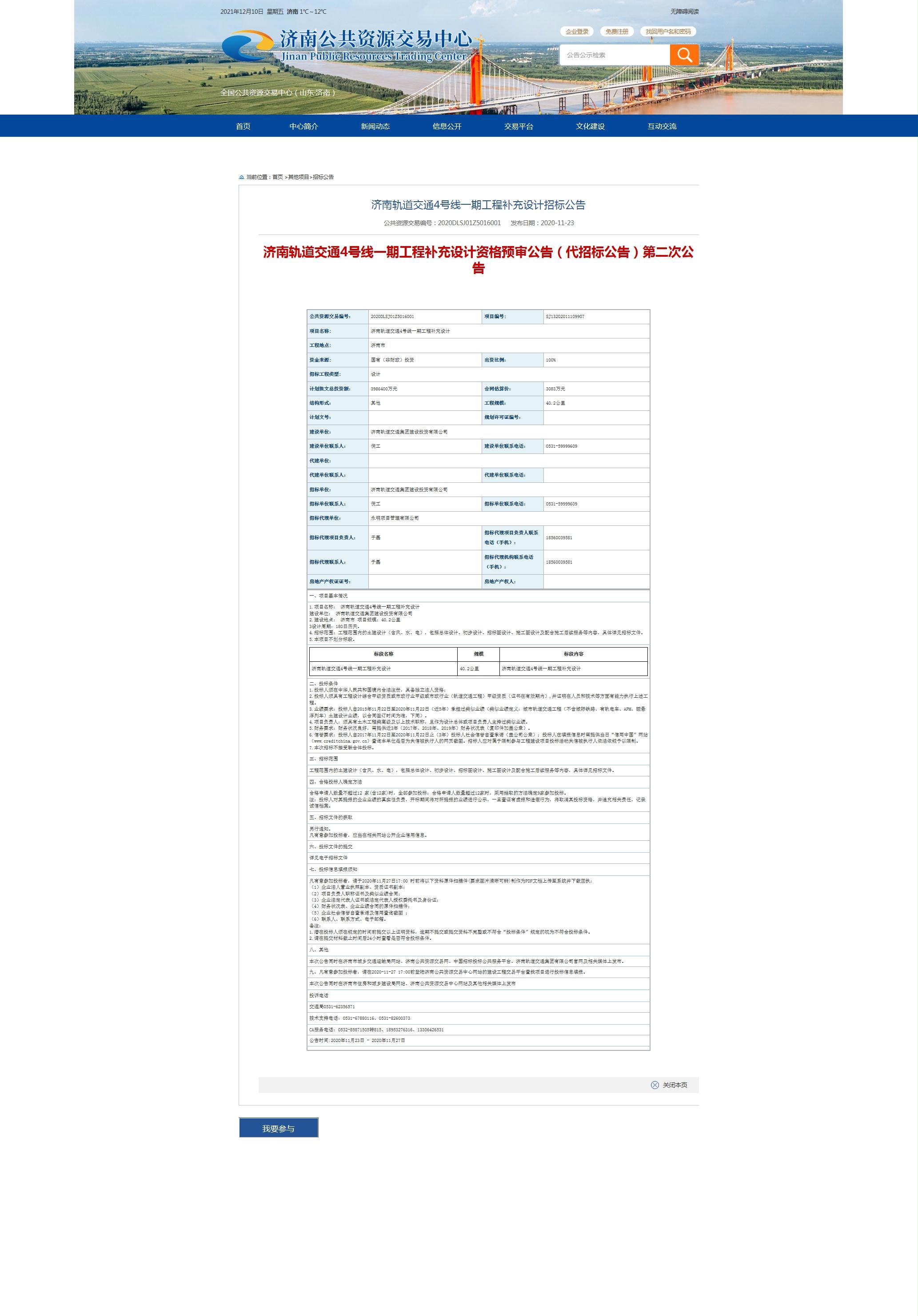 濟南軌道交通4號線一期工程補充設計招標公告